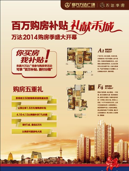 為感謝禾城客戶對于萬達一貫的厚愛,萬達2014購房季活動4月10日盛大開幕!萬達華府推出眾多貼心置業計劃及優惠方案!